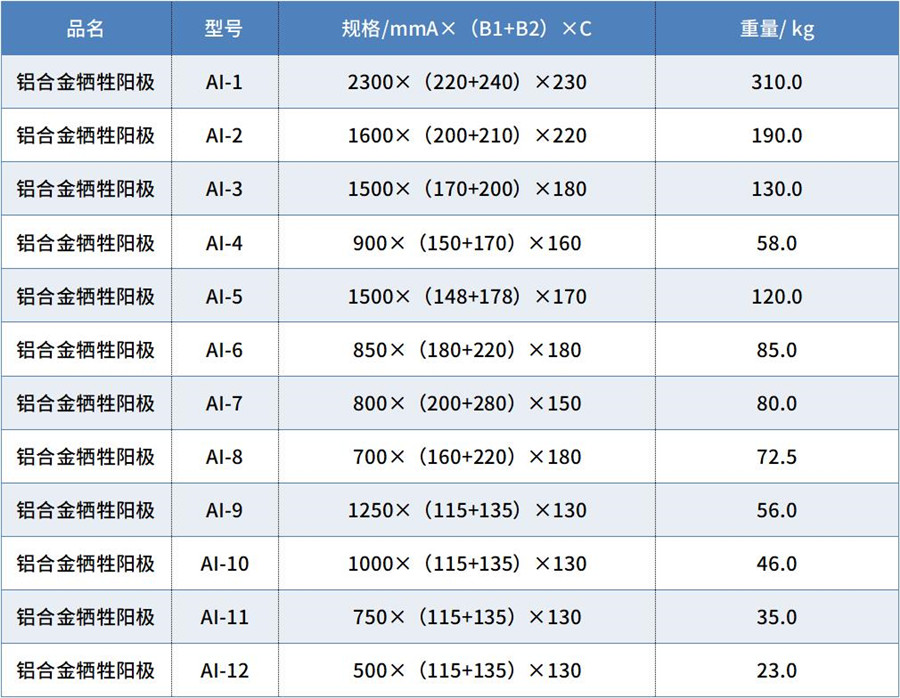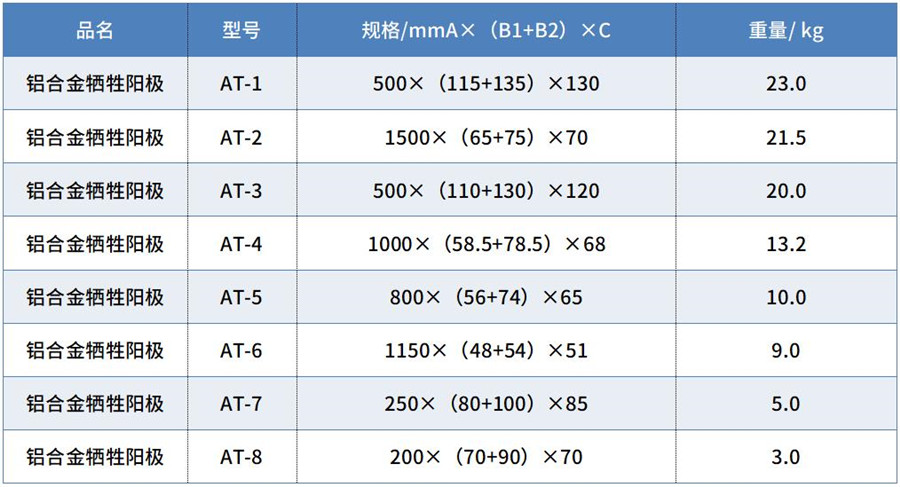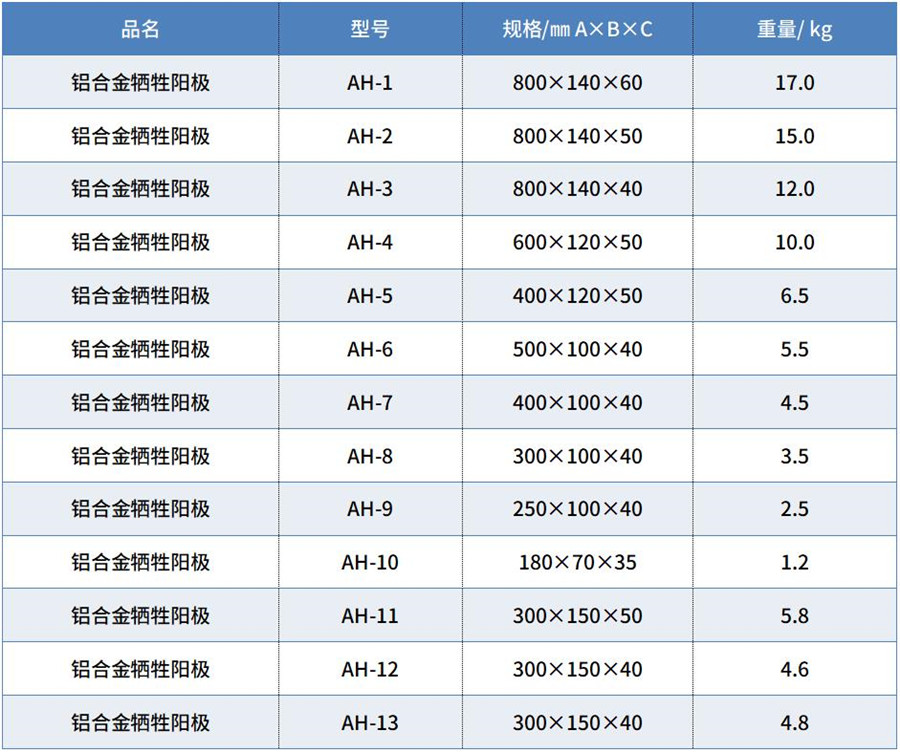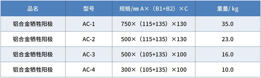 我公司按照GB/T 4948-2002研發(fā)生產(chǎn)的鋁合金犧牲陽極(簡稱:鋁陽極)適于海水介質(zhì)中的船舶、機械設(shè)備、壓載水艙、儲罐內(nèi)壁、濱海設(shè)施、海底管道、碼頭鋼樁、海洋平臺、電纜等設(shè)施金屬防腐蝕的陰極保護(hù)。