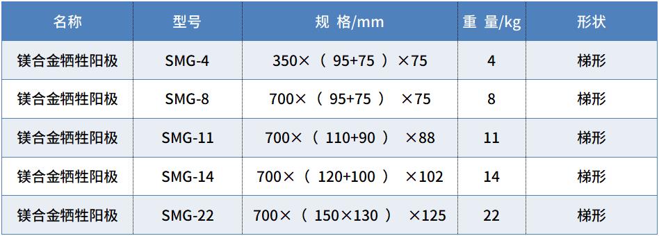 我公司按國標(biāo) GB/T17731-2009《鎂合金犧牲陽極》研發(fā)生產(chǎn)的SMG系列鎂合金犧牲陽極(簡稱:鎂陽極)適用于土壤、淡水等介質(zhì)中的金屬構(gòu)筑物的犧牲陽極陰極保護(hù)。
